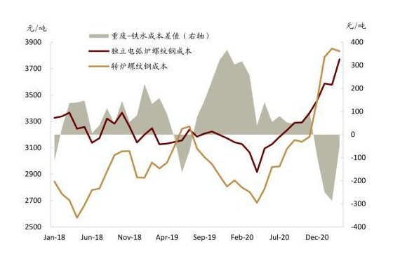 圖表: 在重廢-鐵水差大于100元的情況下,獨立電弧爐與轉(zhuǎn)爐螺紋鋼的成本才會出現(xiàn)逆轉(zhuǎn)