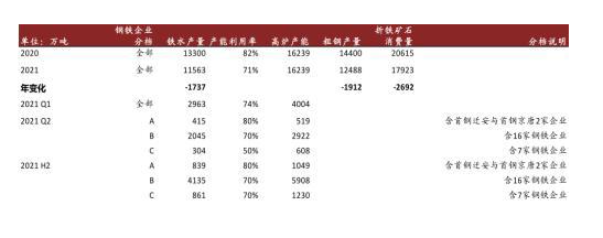 工信部已表態(tài)確保2021年粗鋼產(chǎn)量將同比下降[2]。我們預計今年環(huán)保限產(chǎn)將實現(xiàn)常態(tài)化。唐山市已公布的限產(chǎn)方案中規(guī)定,今年剩下的三個季度(3月20日-12月31日),23家鋼鐵企業(yè)將被施以30%或50%的限產(chǎn)措施(按照產(chǎn)能利用率70%或50%計算)。我們粗略計算,全年唐山生鐵產(chǎn)量將比去年減少1700多萬噸,粗鋼產(chǎn)量減少約1900萬噸,折合成鐵礦石需求則減少約2700萬噸。
